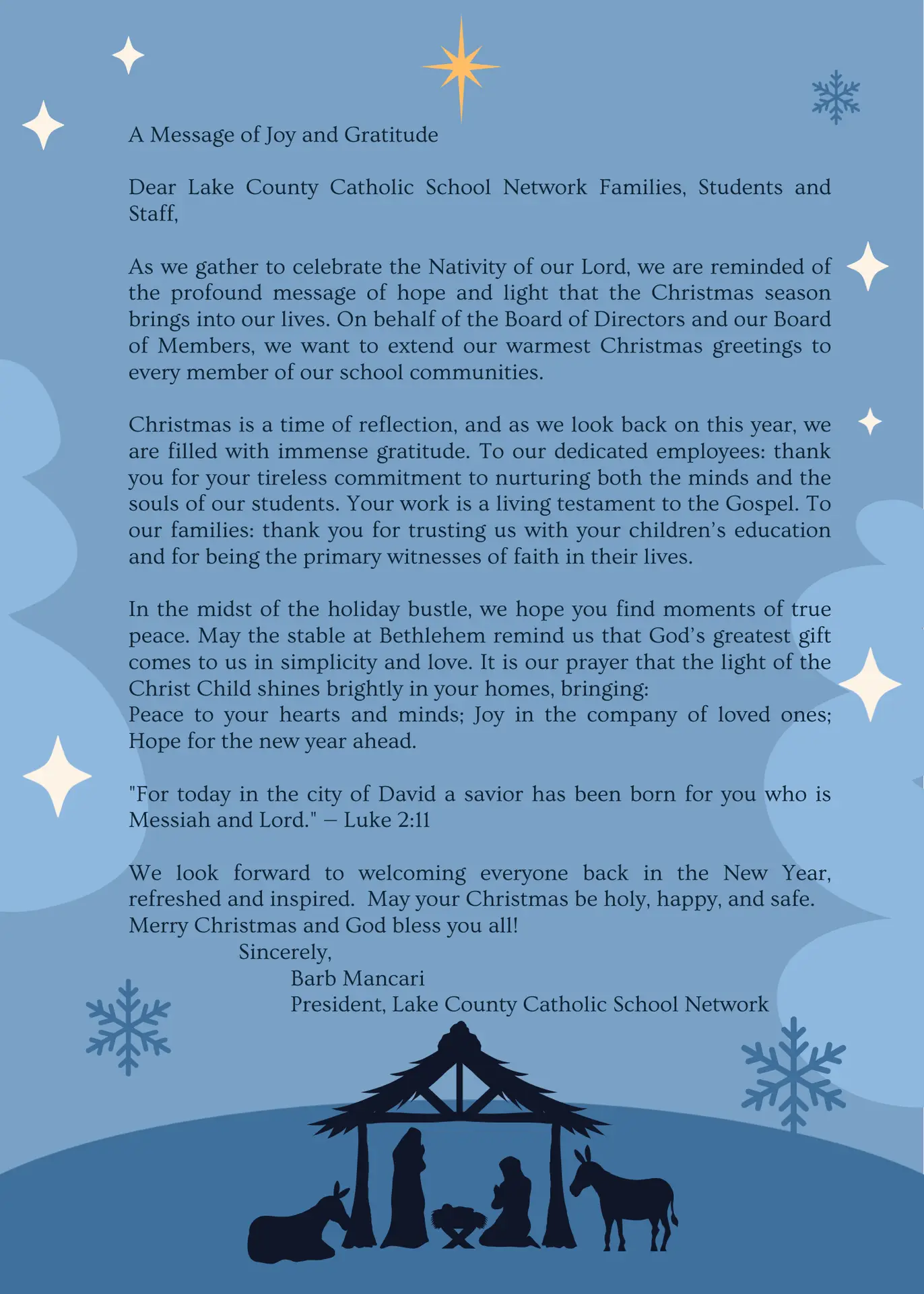 As we gather to celebrate the Nativity of our Lord, we are reminded of the profound message of hope and light that the Christmas season brings into our lives. On behalf of the Board of Directors and our Board of Members, we want to extend our warmest Christmas greetings to every member of our school communities.